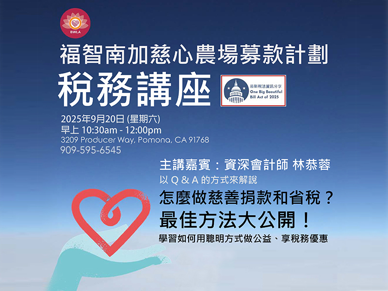 想知道怎么做慈善捐款同时又能省税?最佳方法大公开!为支持 福智南加慈心教育农场募款,特别邀请资深会计师 林恭蓉师姐,以 Q&A 互动方式分享 聪明做公益、享税务优惠,还有最新税法 One Big Beautiful Bill Act of 2025 的资讯分享!税务讲座时间:9月20曰週六10:30am–12:00pm;地点:Pomona Center,讲座后备有精美蔬食午餐,诚挚邀请您参加!